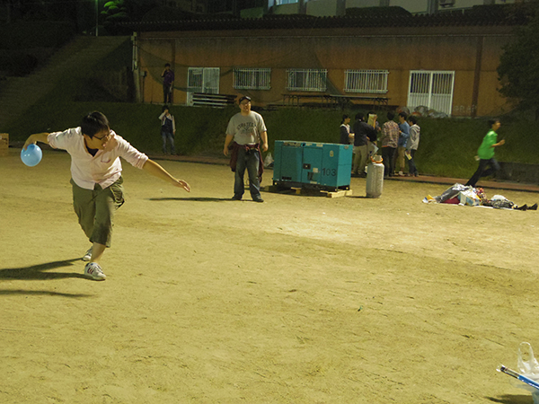水風船で遊ぶ前に、3vs4でテントたたみの競争してみたのですが、2張りたたむのに5分ちょいでした。7人で4張り10分以内です。